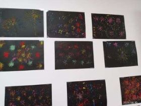 黒の画用紙に水彩絵の具でスタンプとして押して仕上げました。